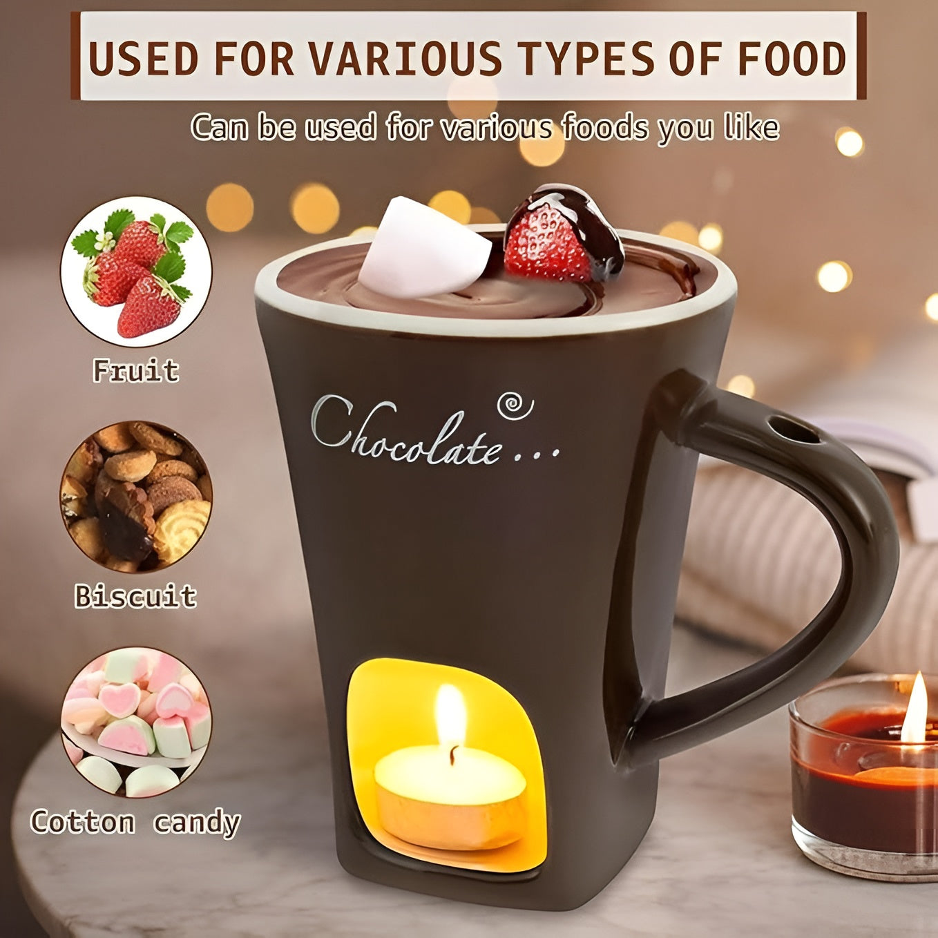Unten kommt ein Teelicht rein, oben die Schokolade. Durch die Wärme schmilzt sie langsam und weich — perfekt zum Dippen.